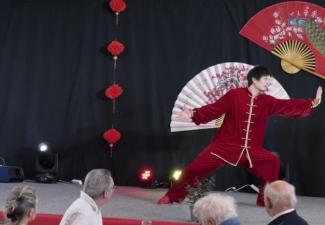 Accompanied by Chinese music, Mr. Xu Meng demonstrated Tai Chi in the center of the stage. He masterfully showcased the art's blend of strength and softness, drawing waves of applause from the audience. Following the demonstration, Mr. Xu invited local university students and residents to join him on stage for a hands-on experience. He taught them basic Tai Chi movements while counting the rhythm in Chinese numerals. Participants followed his motions to the rythme of “one, two, three, four, five, six, seven, eight.” The session concluded with Mr. Xu and the participants performing a short section of Tai Chi together, earning enthusiastic cheers from the audience.