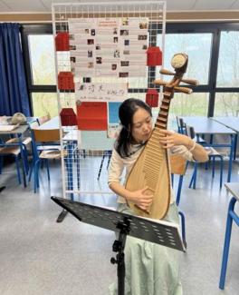 | La journée portes ouvertes s'étant prolongée, de nombreux élèves et parents ont visité les différentes salles de classe de langues. Mme Chen Yunyun a joué de manière aléatoire différents styles de musique, ce qui a incité les parents à s'arrêter et à écouter dans les salles de cours de chinois. Mme Chen a également utilisé une combinaison de performance et d'explication pour vulgariser la connaissance du Pipa pour ceux qui étaient intéressés. Pendant ce temps, le professeur de l'école qui joue des instruments occidentaux a été attiré par la performance de Mme Chen et a essayé de jouer un morceau de musique de style français à l'aide du pipa. |
