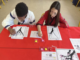 此外,徐老师还组织学生按照步骤体验吹墨画创作,并在活动过程中介绍相关语言知识与文化内容,如有关“梅花”的中国古诗以及中国水墨画的艺术特点等。最终,学生们完成了一幅幅独具特色的吹墨梅花作品,兴致盎然,满载而归。