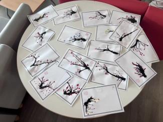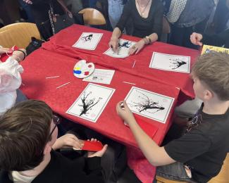 下午13时15分起,徐萌老师共接待了10组前来体验吹墨画的学生,参与学生分别来自周边五所中学。活动开始前,徐老师首先向学生作简要介绍,讲解吹墨画的制作步骤及注意事项,随后指导学生自主创作。每位学生均完成了一幅独具特色的吹墨画作品,并在作品上加盖了中国传统印章。